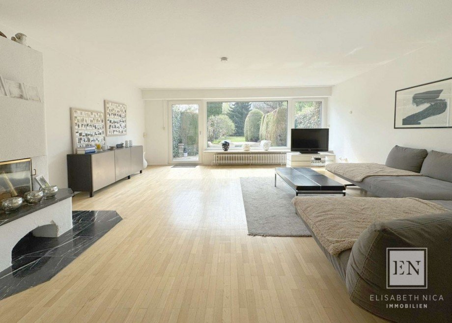 - Lichtdurchflutetes Wohnzimmer mit großer Fensterfront und Kamin